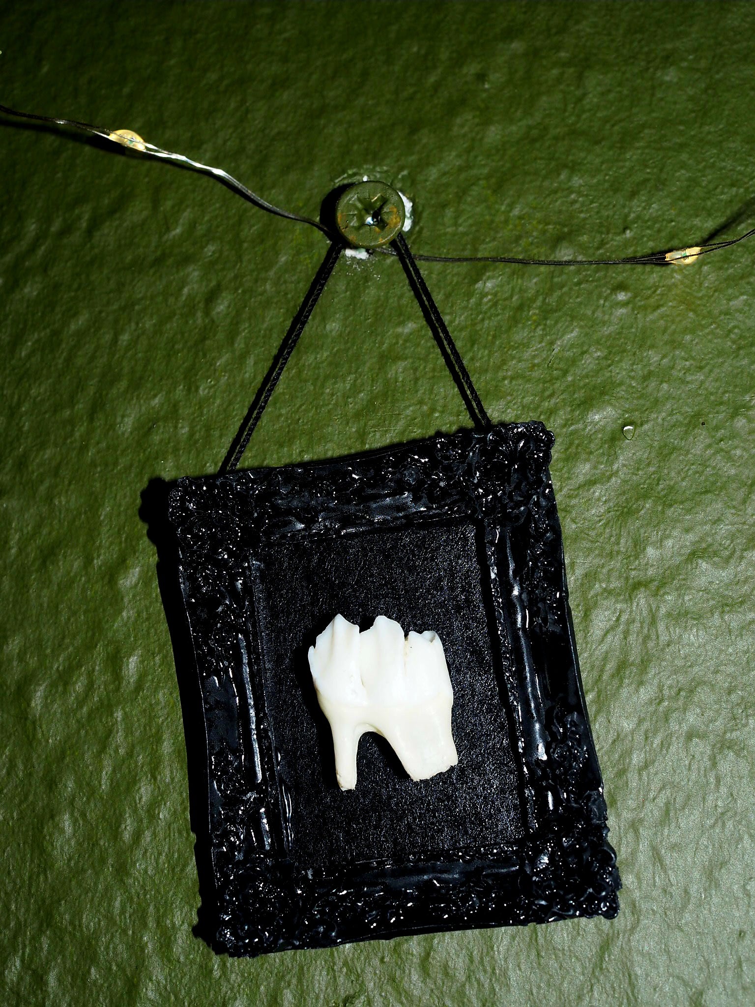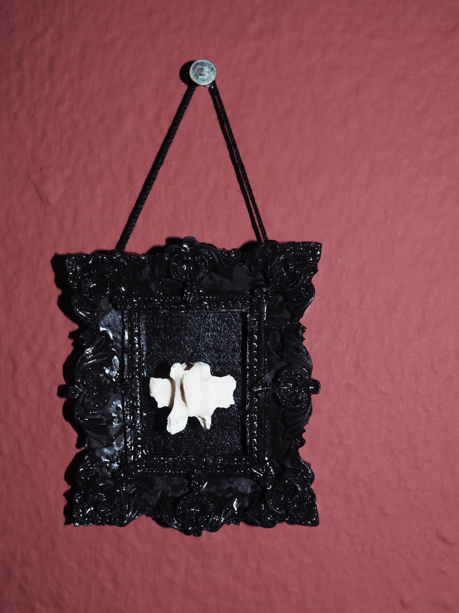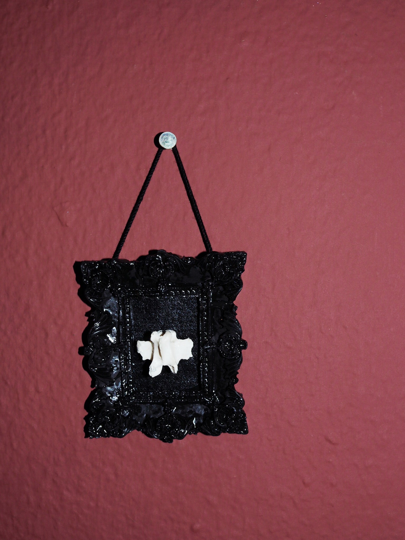 This small black baroque-style frame (approx. 3 x 5 cm) holds a real animal bone as its centerpiece.